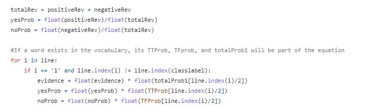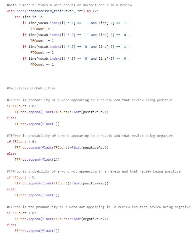 These probabilities include the number of times a word from the vocabulary is used or not used in the test set the probability of a word appearing or not appearing in a positive review and the probability of a word appearing or not appearing in a negative comment.