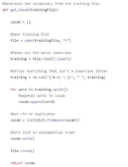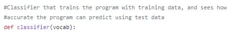 The program takes the training set and creates a vocabulary, or a list of words that it has learned from the training set.