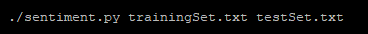 - Example: ./sentiment.py trainingSet.txt testSet.txt